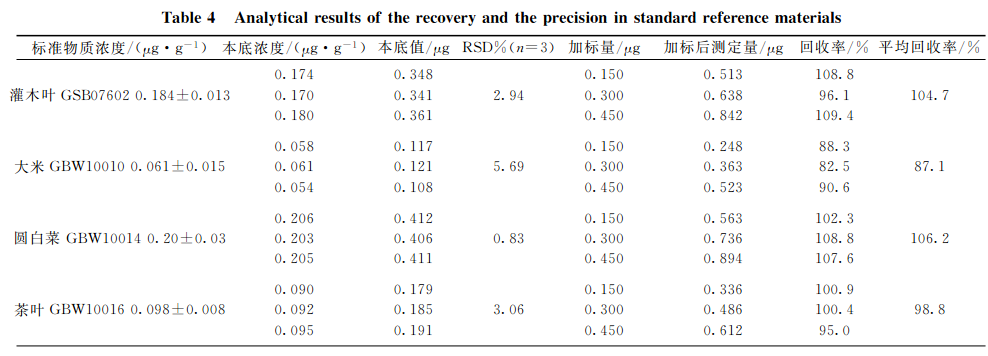 分別選取灌木葉、大米、圓白菜、茶葉和柑橘葉五種植物標(biāo)準(zhǔn)樣品,每種重復(fù)3次準(zhǔn)確稱取2.0g(精確至0.0001g),按上述實(shí)驗(yàn)條件進(jìn)行消解,測定本底值。再對(duì)每種植物標(biāo)樣稱取子樣,每種重復(fù)3次準(zhǔn)確稱取2.0g(精確至0.0001g),此次每種試樣中分別加入1.0mg?L-1硒標(biāo)準(zhǔn)溶液150,300,450gL,進(jìn)行消解并測定加標(biāo)后值,同時(shí)測定硒質(zhì)控環(huán)境標(biāo)準(zhǔn)溶液(GSBZ50031-94(203710)),結(jié)果見表4。可見,硒標(biāo)準(zhǔn)加標(biāo)回收率在87.1%~106.2%之間,精密度(n=3)在0.83%~5.69%之間,所測結(jié)果均與標(biāo)準(zhǔn)物質(zhì)的參考值吻合,完全達(dá)到分析要求。