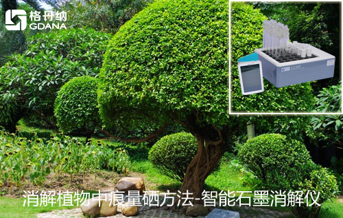 稱取2.0g(精確至0.0001g)洗凈60C烘干粉碎的植物樣,加入10.0mL硝酸十高氯酸(8+2)(g)混酸及幾粒玻璃珠于100mL刻度消解管中,上端放彎頸玻璃小漏斗便于回流,混勻放置在石墨消解儀的石墨加熱孔中,于通風(fēng)良好的通風(fēng)櫥內(nèi)冷消化過夜12h后,石墨消解儀會(huì)按預(yù)先設(shè)定的消解程序進(jìn)行升溫消化,升溫程序?yàn)?室溫→50C保持0.5h100C保持1h-→160C保持2h→-180C保持,保持時(shí)間視樣品消化情況而定。其間要觀察消化液顏色,若較深,及時(shí)補(bǔ)加硝酸,反復(fù)多次,直到?jīng)]有棕色氮氧化物氣體冒出。當(dāng)溶液變?yōu)榍辶翢o色并伴有濃白煙岀現(xiàn)時(shí),繼續(xù)保持180C加熱,其間可加入1~2mL純水1~2次,目的是趕殘余酸,這樣可以解決濕法消解測定空白高的特點(diǎn),直至加熱消化到剩余體積為2mL左右時(shí),切不可蒸干,取下冷卻至室溫,再加入5.0mL50%HCl(g)于剩余消化液中,再次至于消解儀中升溫至100C(或沸水浴加熱),保持10~15mn,溶液變?yōu)榍辶翢o色并伴有白煙時(shí),逐將Se+還原成Se+。取出冷卻用純水定容至25mL,密封搖勻備用。同時(shí)做試劑空白。