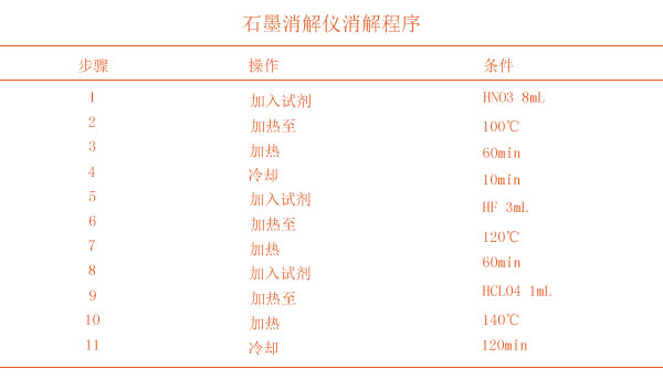 稱取試樣0.2~0.5g(精確到0.1mg)于聚四氟乙烯消解管中,將消解管放入石墨消解裝置石墨孔中。設(shè)置消解程序進(jìn)行消解。消解完畢后冷卻至室溫,然后加入硝酸溶液(1+1)1mL溶解殘?jiān)?,轉(zhuǎn)移至50mL容量瓶中,用少量去離子水洗滌消解罐,洗滌液一并轉(zhuǎn)移至容量瓶,同時測定消解全程空白。智能石墨消解的消解程序下面見表1。