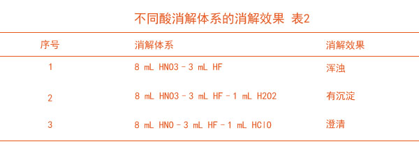 消解試劑的選擇對試樣預(yù)處理的結(jié)果影響很大。因?yàn)殂t元素被土壤中的硅酸鹽礦物晶格所包藏,而HF是唯一能分解硅酸鹽的酸類。因此本實(shí)驗(yàn)選擇HNO3–HF、HNO3–HF–H2O2和HNO3–HF–HClO43種消解體系進(jìn)行試驗(yàn)。從消解結(jié)果的外觀進(jìn)行初步比較再選擇消解試樣的消解液,消解效果見表2。對比3種消解體系的消解情況,發(fā)現(xiàn)HNO3–HF體系和HNO3–HF–H2O2體系均不能完全消解樣品,故選擇HNO3–HF–HClO4體系作為消解液。