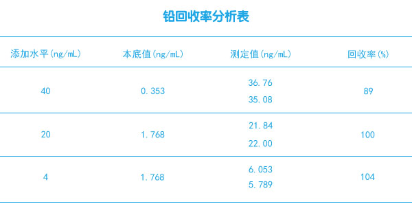 通過對11個空白的測定,以3倍空白的標準偏差所對應的濃度值表示,方法檢出限為2.1ng/mL。精密度以在相同條件下測定的6次啤酒所得值的相對標準偏差表示,為8.3%。為了驗證方法的實用性,利用建立的整套方法分析不同樣品中鉛的含量及回收率(見表格回收率測定結(jié)果)。