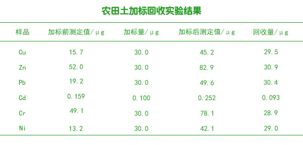 同時(shí)對(duì)農(nóng)田土進(jìn)行加標(biāo)實(shí)驗(yàn),平行加標(biāo)3份,加標(biāo)回收率進(jìn)行測(cè)定,結(jié)果如下表。