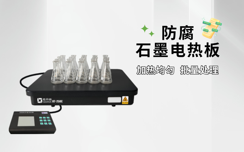 2. 石墨電熱板:石墨電熱板以石墨為表面加熱材料,具有優(yōu)秀的耐高溫性和耐腐蝕性。石墨的導熱性好,能夠在高溫下迅速而均勻地傳遞熱量,不易產生形變或損壞。格丹納石墨電熱板HT-250C另外在加熱臺面增加特氟龍涂層防止強酸堿腐蝕。