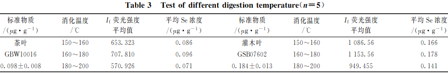 準(zhǔn)確稱取2.0g(精確至0.0001g)植物標(biāo)樣茶葉(GBW10016)樣品和灌木葉(GSB07602)樣品各15份,分3組,每組5次重復(fù)稱樣,以2.2中HNO3+HClO4(V+V)(8+2)mL混酸比溶液進(jìn)行消化處理,再以不同的消解溫度進(jìn)行消化處理,測試硒的相對(duì)熒光值,結(jié)果見表3。