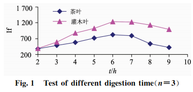 準(zhǔn)確稱取2.0g(精確至0.0001g)植物標(biāo)樣茶葉(GBW10016)樣品和灌木葉(GSB07602)樣品各24份,分8組,每組3次重復(fù)稱樣,以2.2中HNO3+HClO4(V+V)(8+2)mL混酸比溶液,以表3中的160~180C為消化溫度,分別設(shè)定8組消化時(shí)間為2,3,4,5,6,7,8,9h,測試硒的相對(duì)熒光值,結(jié)果見圖1。