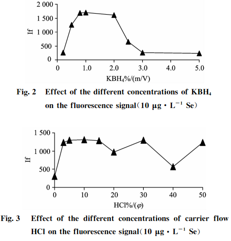 在儀器條件不變的情況下,測試10Hg?L-的Se標(biāo)準(zhǔn)溶液隨載流HCl和還原劑KBH4濃度變化對(duì)硒熒光強(qiáng)度的影響,結(jié)果見圖2和圖3??芍?當(dāng)載流HCl和還原劑KBH4濃度低時(shí)熒光強(qiáng)度低,信號(hào)靈敏度差,說明還原能力弱;當(dāng)載流HCl和還原劑KBH41濃度增大時(shí),熒光強(qiáng)度也隨之增強(qiáng);當(dāng)兩者濃度太高時(shí),反應(yīng)產(chǎn)生的氫氣多,泡沫都易沖入管道,熒光強(qiáng)度反而會(huì)降低,這是由于過量的氫氣稀釋了火焰中硒原子蒸氣造成的。實(shí)驗(yàn)結(jié)果表明:對(duì)于10pg?L1的Se標(biāo)準(zhǔn)溶液,還原劑KBH4濃度在0.8%~2.0%(m/V)之間,載流HC1濃度在4%~15%(g)之間,火焰平穩(wěn),熒光值達(dá)到穩(wěn)定,信噪比和靈敏度高。綜合考慮選擇還原劑濃度為1.0%KBH4(m/V)+0.5%KOH(m/V),載流HC1為10%(g)。