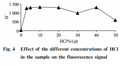 品消化過程的酸度確保了Se+還原成Se+,上機(jī)測試前樣品經(jīng)稀釋后制備液酸度也會(huì)影響硒的測定結(jié)果。分別吸取100gg?L-標(biāo)準(zhǔn)應(yīng)用液5.0mL于7個(gè)50mL的具塞比色管中,分別加入0.0,1.5,2.5,5.0,10.0,15.0,20.025,0mL濃HCl,用純水稀釋定容至刻度,用以制備不同酸度的10gg?L硒標(biāo)準(zhǔn)溶液,以2.4中的載流和還原劑濃度進(jìn)行上機(jī)測定,結(jié)果見圖4。可知,扣除空白后,HCl(g)在3%~20%范圍內(nèi),10gg?L-1硒標(biāo)準(zhǔn)溶液具有較強(qiáng)且穩(wěn)定的熒光強(qiáng)度;當(dāng)樣品HCl(q)>20%時(shí),硒熒光值受到抑制且不穩(wěn)定,考慮到樣品酸度的提高有利于硒的還原,同時(shí)可以減少共存元素的干擾,故本方法選用15%HCl(g)酸度作為樣品和標(biāo)準(zhǔn)溶液上機(jī)測試時(shí)制備液的酸度,才能保證測量的穩(wěn)定性和一致性。