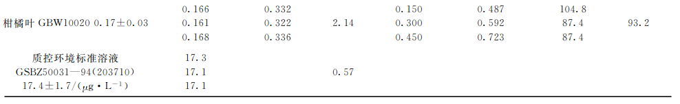 分別選取灌木葉、大米、圓白菜、茶葉和柑橘葉五種植物標(biāo)準(zhǔn)樣品,每種重復(fù)3次準(zhǔn)確稱取2.0g(精確至0.0001g),按上述實(shí)驗(yàn)條件進(jìn)行消解,測定本底值。再對(duì)每種植物標(biāo)樣稱取子樣,每種重復(fù)3次準(zhǔn)確稱取2.0g(精確至0.0001g),此次每種試樣中分別加入1.0mg?L-1硒標(biāo)準(zhǔn)溶液150,300,450gL,進(jìn)行消解并測定加標(biāo)后值,同時(shí)測定硒質(zhì)控環(huán)境標(biāo)準(zhǔn)溶液(GSBZ50031-94(203710)),結(jié)果見表4。可見,硒標(biāo)準(zhǔn)加標(biāo)回收率在87.1%~106.2%之間,精密度(n=3)在0.83%~5.69%之間,所測結(jié)果均與標(biāo)準(zhǔn)物質(zhì)的參考值吻合,完全達(dá)到分析要求。