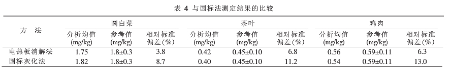 以圓白菜標(biāo)準(zhǔn)物質(zhì)(CBW10014)茶葉標(biāo)準(zhǔn)物質(zhì)(GBW10016)、雞肉標(biāo)準(zhǔn)物質(zhì)(GBW10018)為比對樣品,設(shè)置5個平行,用新建預(yù)處理方法與國家標(biāo)準(zhǔn)中灰化法同時測定3種比對樣品,并對結(jié)果進(jìn)行比較。