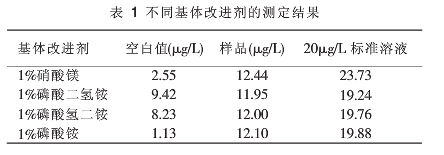 分別選用濃度為5%的硝酸鎂、磷酸二氫銨、磷酸氫二銨、磷酸銨溶液作為基體改進(jìn)劑對鉻標(biāo)樣及樣品進(jìn)行測定。具體測定方法同其他幾項(xiàng)。