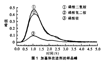 試驗(yàn)分別吸取5mL 5%硝酸鎂、磷酸二氫銨、磷酸氫二銨、磷酸銨作為基體改進(jìn)劑對鉻標(biāo)樣及樣品進(jìn)行測定,其基改劑的上機(jī)濃度為1%(體積分?jǐn)?shù))。結(jié)果(表1)表明,硝酸鎂作為基改劑時,標(biāo)樣響應(yīng)值較高,標(biāo)樣與樣品測量值偏高;而選用磷酸二氫銨、磷酸氫二銨、磷酸銨為基改劑時,響應(yīng)峰峰形好(圖1),測定結(jié)果沒有差異,回收率也在范圍內(nèi)。但選用的磷酸二氫銨、磷酸氫二銨溶液作空白測 定時,空白值偏高。因此,選擇5%磷酸銨作為鉻測定的基體改進(jìn)劑,這與國標(biāo)法選用的一致。