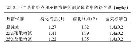 以菠菜標(biāo)準(zhǔn)物質(zhì)(GBW 10015)為研究對象,加入6mL混合酸與電熱板消解。消化終點(diǎn)按以下2種方案進(jìn)行:(1)消化至冒濃白煙,消化液0.5mL左右;(2)消化至近干,沒有流動的消化液。取下稍冷,將以上2種不同消化方案得到的消化液分為3個試驗(yàn)組。各試驗(yàn)組分別加入1mL超純水、1mL 25%硝酸溶液、1mL 25%鹽酸溶液進(jìn)行熱溶解,超純水定容至25mL,于原子吸收分光光度計上測定各樣品中鉻含量,并確定消化終點(diǎn)及助溶劑,進(jìn)而確定預(yù)處理方法。