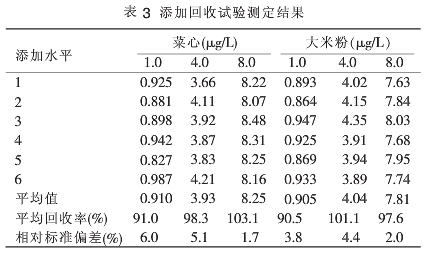 在菜心、大米粉2個樣品中分別添加水平為1.0、4.0、8.0μgL的標(biāo)準(zhǔn)使用液,試驗(yàn)設(shè)各個平行,各樣品加標(biāo)回收率和精密度的結(jié)果見表3。結(jié)果表明,本方法測定兩種樣品,添加回收率高(90%~105%),多次測定結(jié)果平行性好。